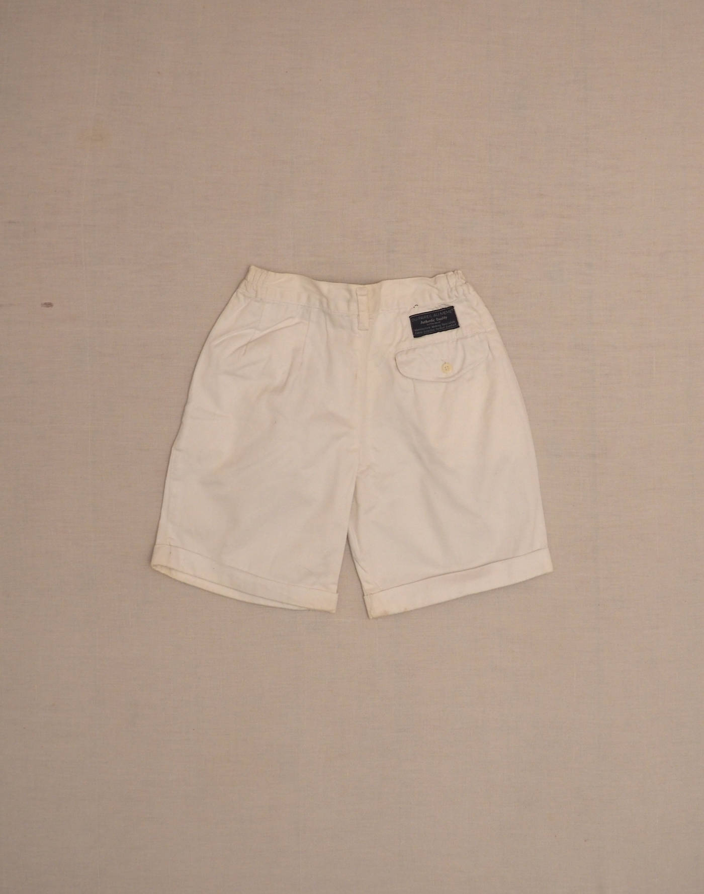 Size 6 years. Attractive white cotton shorts, sewn-in lapels on lower leg, belt loops. Two front pockets, one buttoned back pocket, slightly elastic waistband with button and fly. Very good condition, 100% cotton.