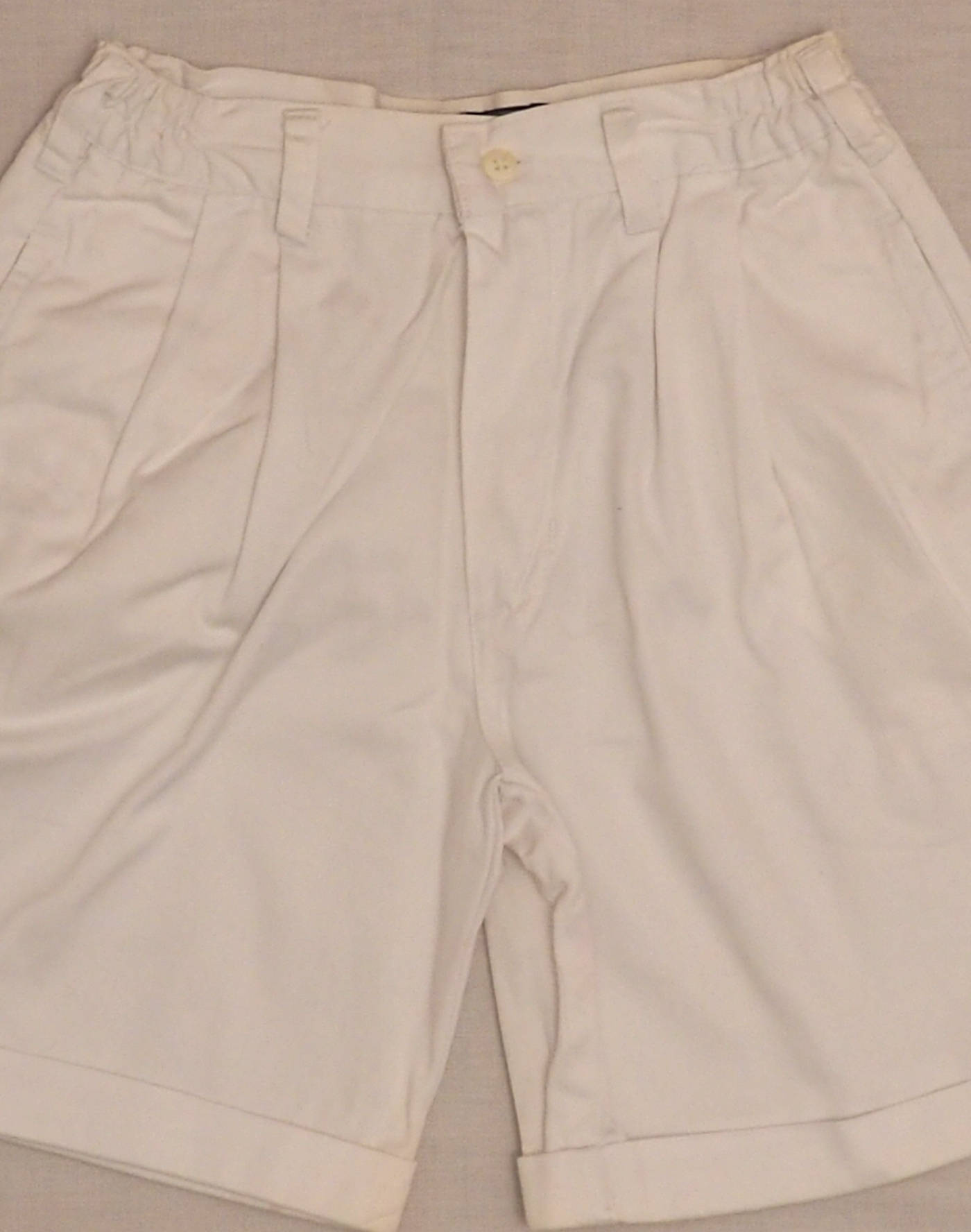 Size 6 years. Attractive white cotton shorts, sewn-in lapels on lower leg, belt loops. Two front pockets, one buttoned back pocket, slightly elastic waistband with button and fly. Very good condition, 100% cotton.