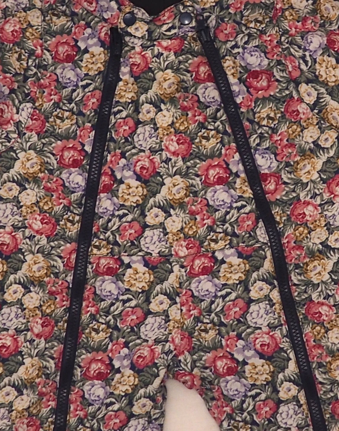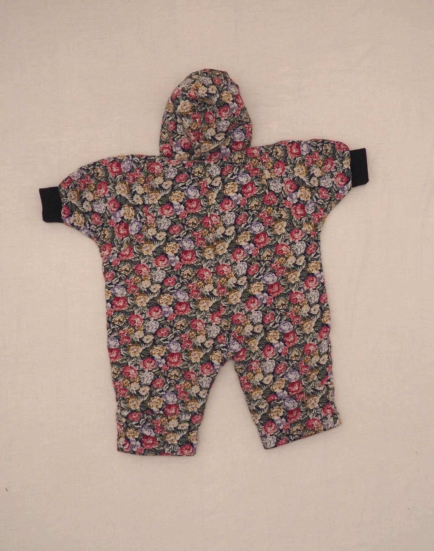 Lovely floral cotton (not waterproof) fleece winter jumpsuit with hood, navy blue jersey lining, two leg zippers and two collar snaps. Made in France, very good condition, 100% cotton.