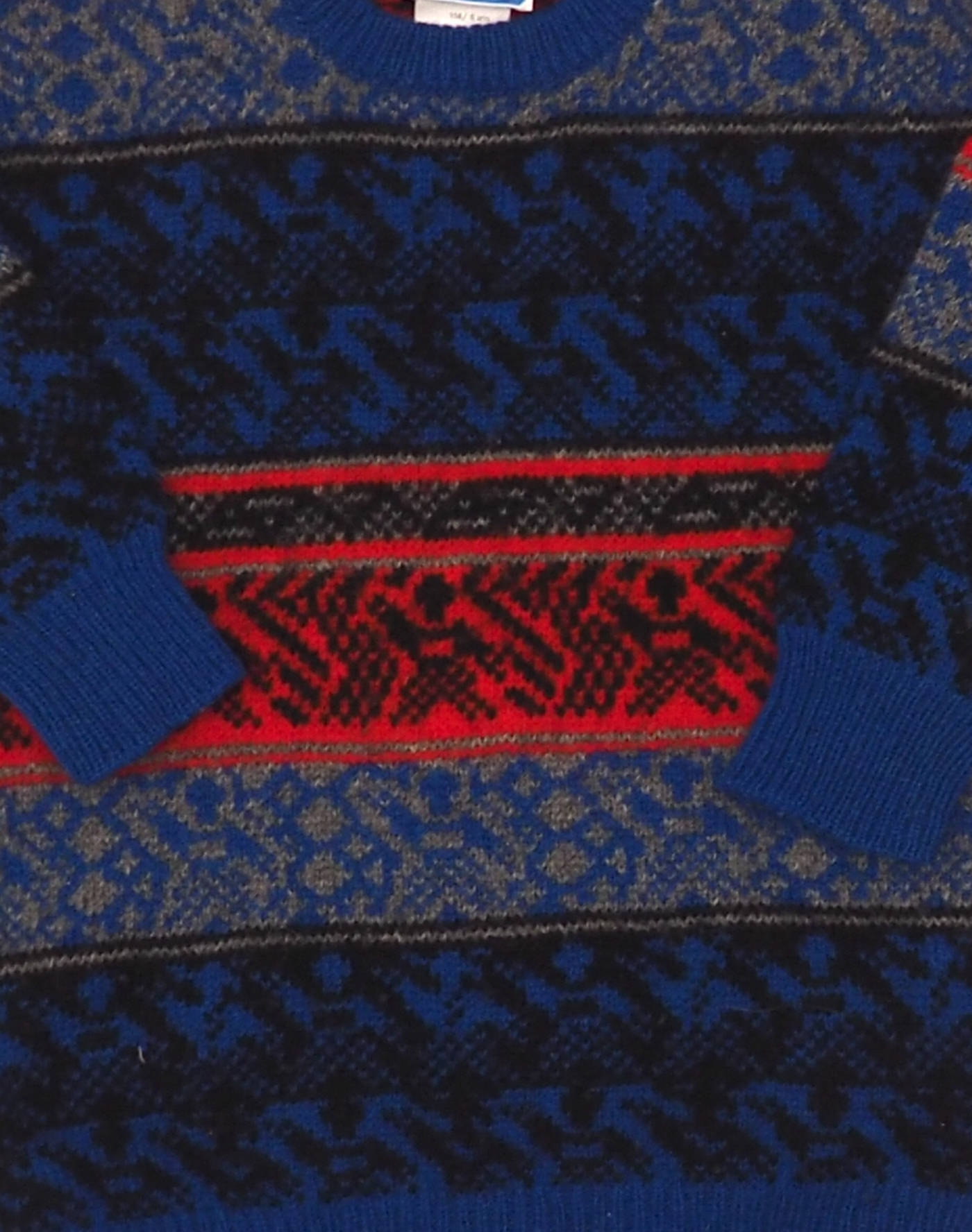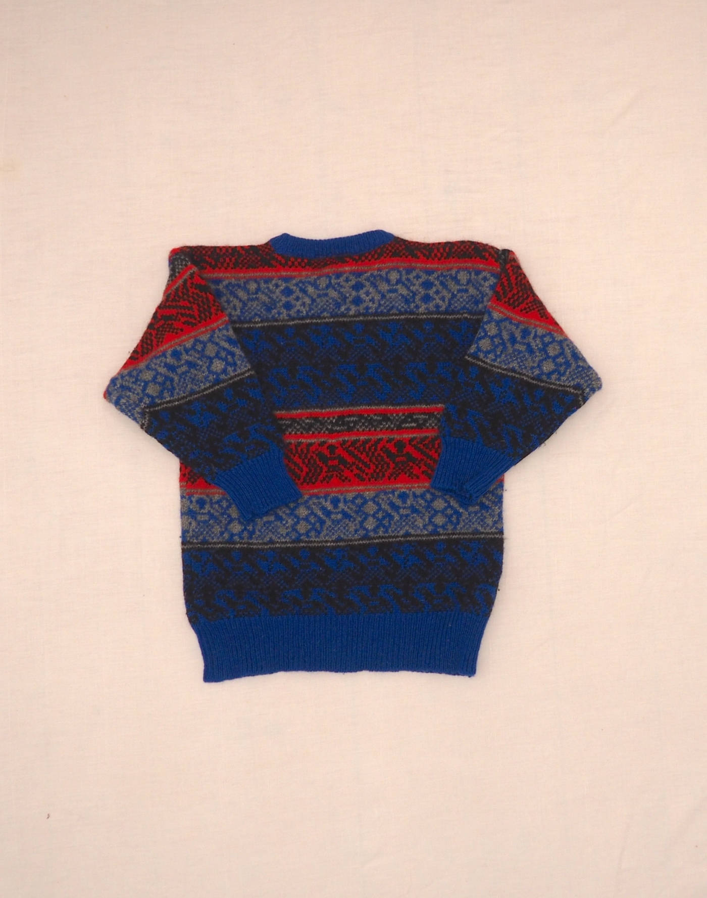 Size 6 years. Vintage Catimini. Beautiful blue and red jacquard sweater, long sleeves, round neck. Very good condition, 100% wool, made in Mauritius.